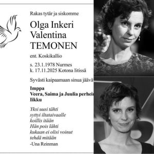 Rakastettu näyttelijä Olga Temonen, 47, kuoli pitkäaikaisen sairauden uuvuttamana 17. marraskuuta. Nyt Ylä-Karjala-lehdessä on julkaistu Olgan kuolinilmoitus, joka on suunnattu rakkaalle tyttärelle ja siskolle. Olga syntyi Nurmeksessa,…