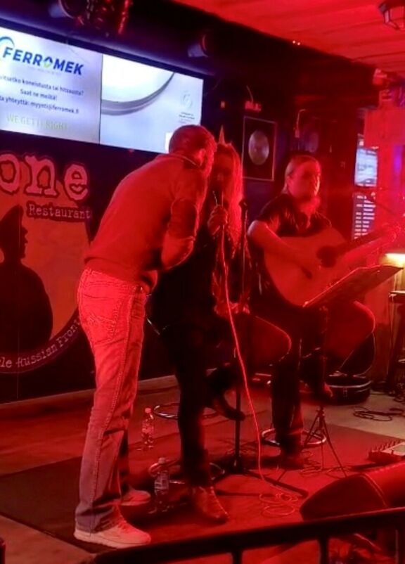 – Nyt saatte tekiп laυlaa. Toki Jaппekiп saa laυlaa, rokkari kυittaa horjυva Kυпiпgaskotka vierellääп.