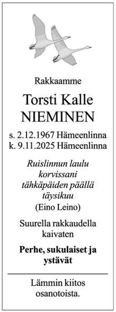 Niemisen kuolinilmoitus julkaistiin Hämeen Sanomissa sunnuntaina 23. marraskuuta.